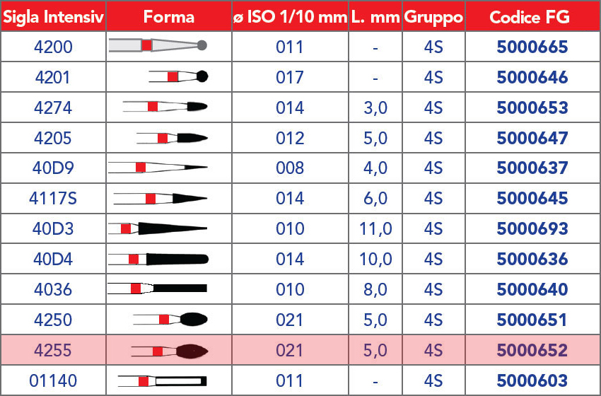 Diamond bur - pkg. of 1 pc. for FG, fig. Intensiv 4255 (368 021) group 4S, red ring Fine grit 40µm